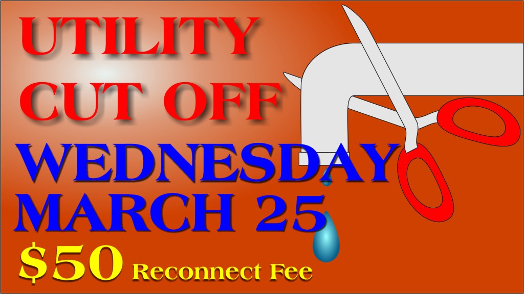 Utility cut-off day is Wednesday, March 25. Please call or come by the Town Hall to take care of your bill to avoid reconnect fees. You can call and use your credit or debit card over the phone, if you like.