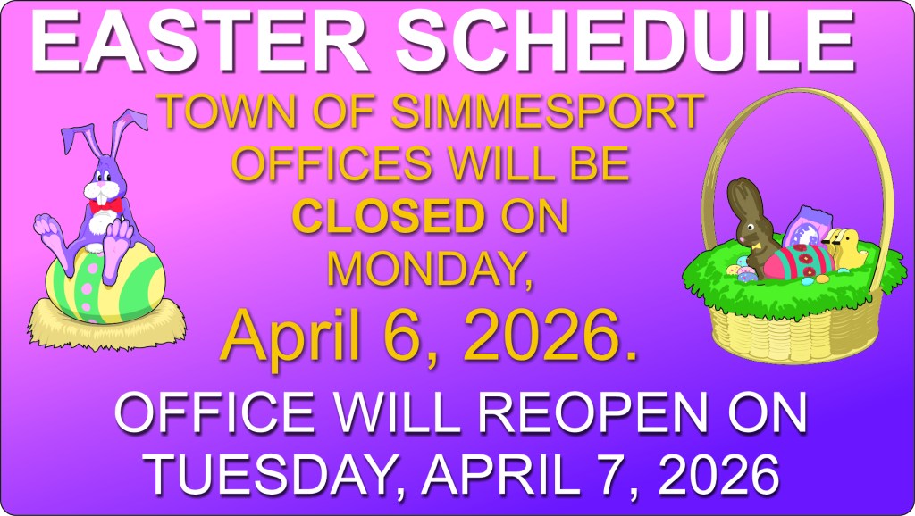 The Town of Simmesport offices will be closed on Monday, April 6, 2026, in celebration of the Easter Holidays. Regular hours will resume on Tuesday, April 7, 2026. The Town of Simmesport would like to wish everyone a safe and happy Easter Holiday.